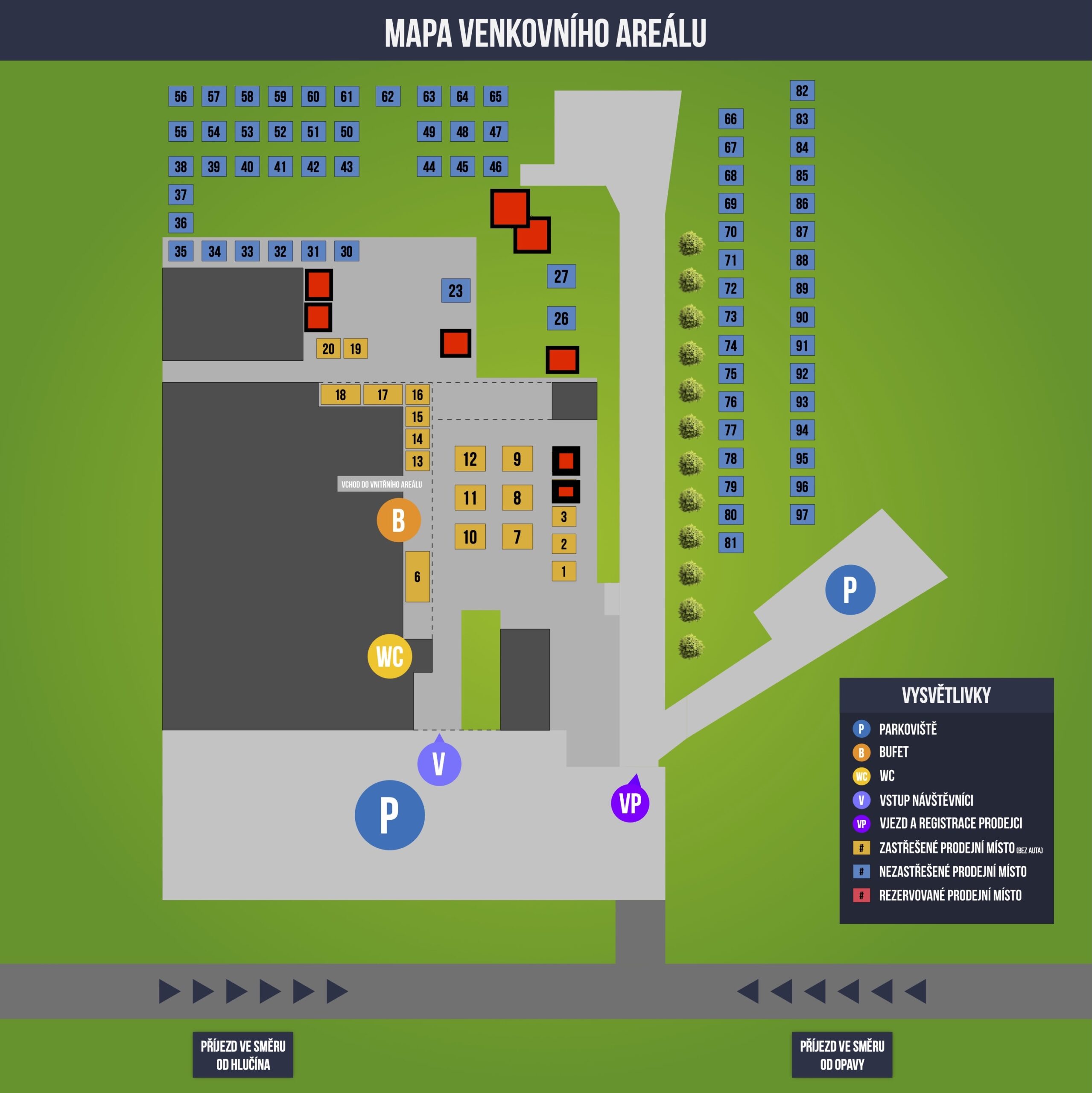 Prodejní místa zastřešená: vevnitř 101 – 120, venku 1 – 22